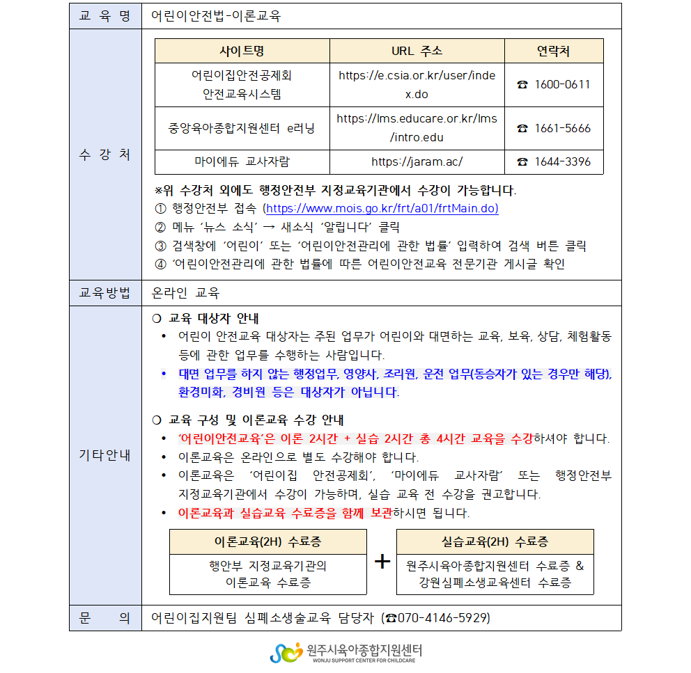 '¾î¸°À̾ÈÀü±³À°'Àº ÀÌ·Ð 2½Ã°£ + ½Ç½À 2½Ã°£ ÃÑ 4½Ã°£ ±³À°À» ¼ö°ÇÏ¼Å¾ß ÇÕ´Ï´Ù.