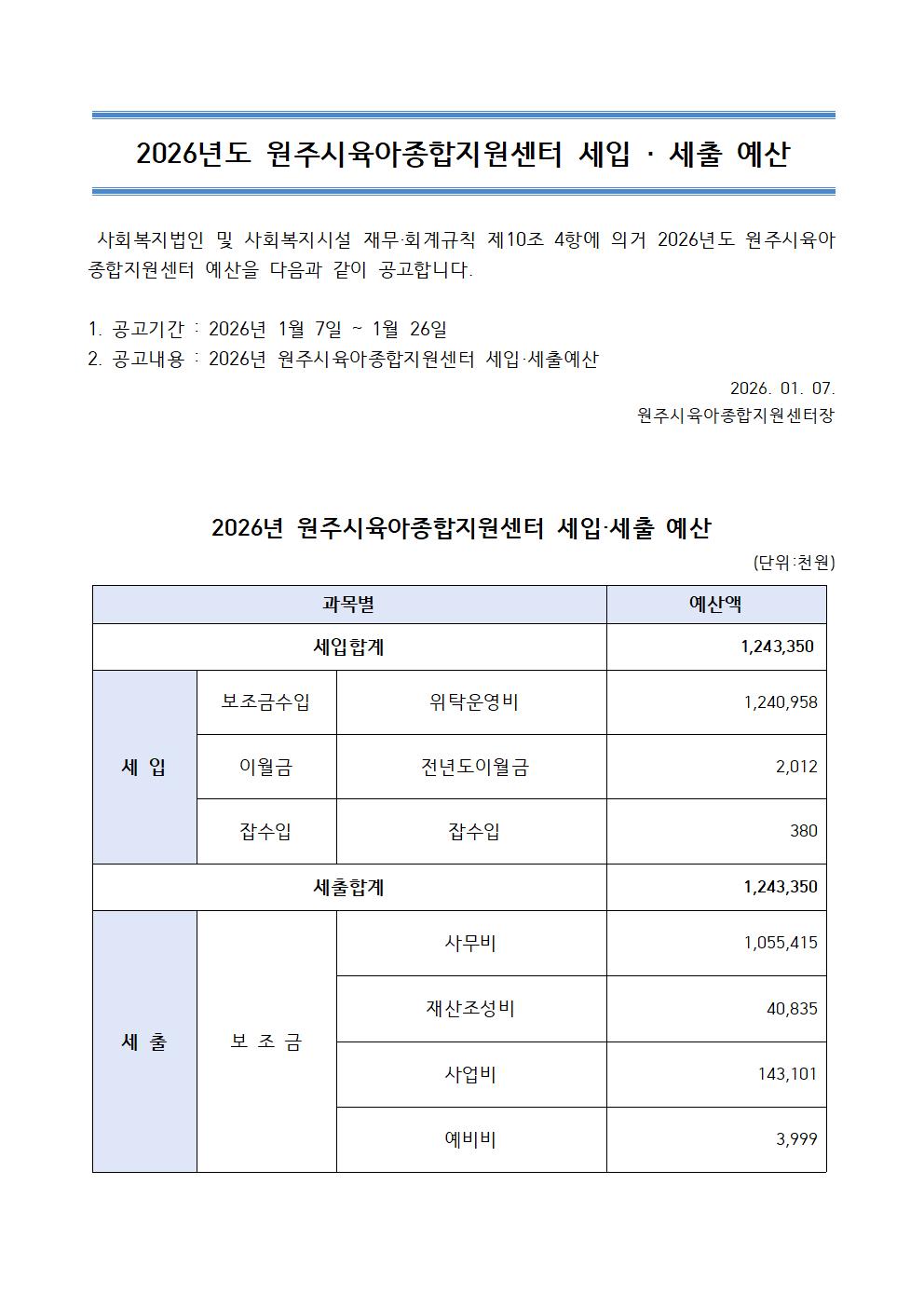 2026³âµµ ¿øÁÖ½ÃÀ°¾ÆÁ¾ÇÕÁö¿ø¼¾ÅÍ ¼¼ÀÔ ¡¤ ¼¼Ãâ ¿¹»ê °ø°í