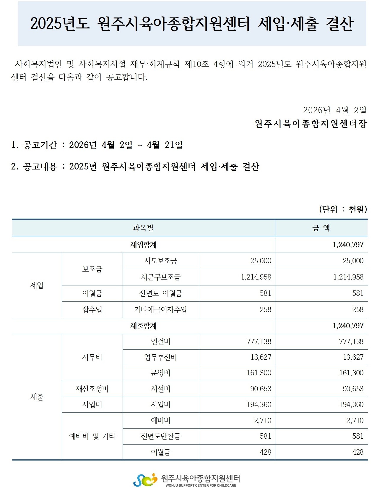 2025³â ¿øÁÖ½ÃÀ°¾ÆÁ¾ÇÕÁö¿ø¼¾ÅÍ ¼¼ÀÔ¡¤¼¼Ãâ °á»ê