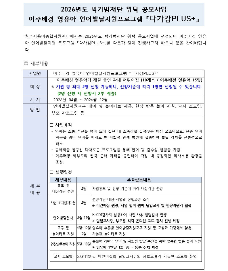 2026³âµµ ¹Ú±â¹üÀç´Ü À§Å¹ °ø¸ð»ç¾÷ - ÀÌÁÖ¹è°æ ¿µÀ¯¾Æ ¾ð¾î¹ß´ÞÇÁ·Î±×·¥ ¡¸´Ù°¡°¨PLUS+¡¹ ¾È³»¹® ¹× ½Åû¼