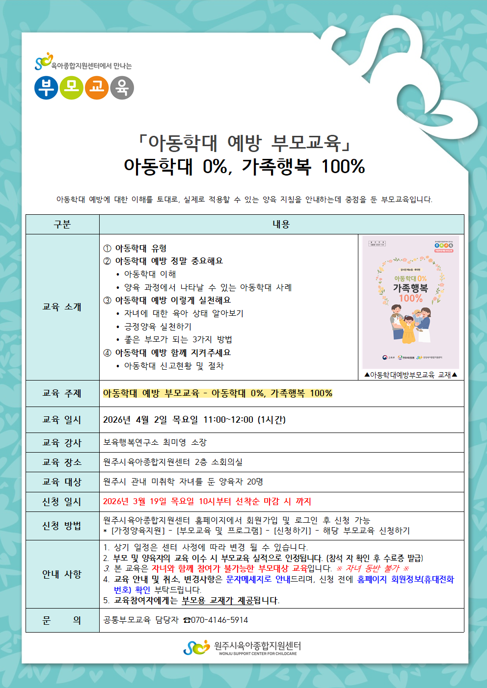 | ¹®ÀÇ | °øÅëºÎ¸ð±³À° ´ã´çÀÚ ¢Ï 070-4146-5914 | ||
